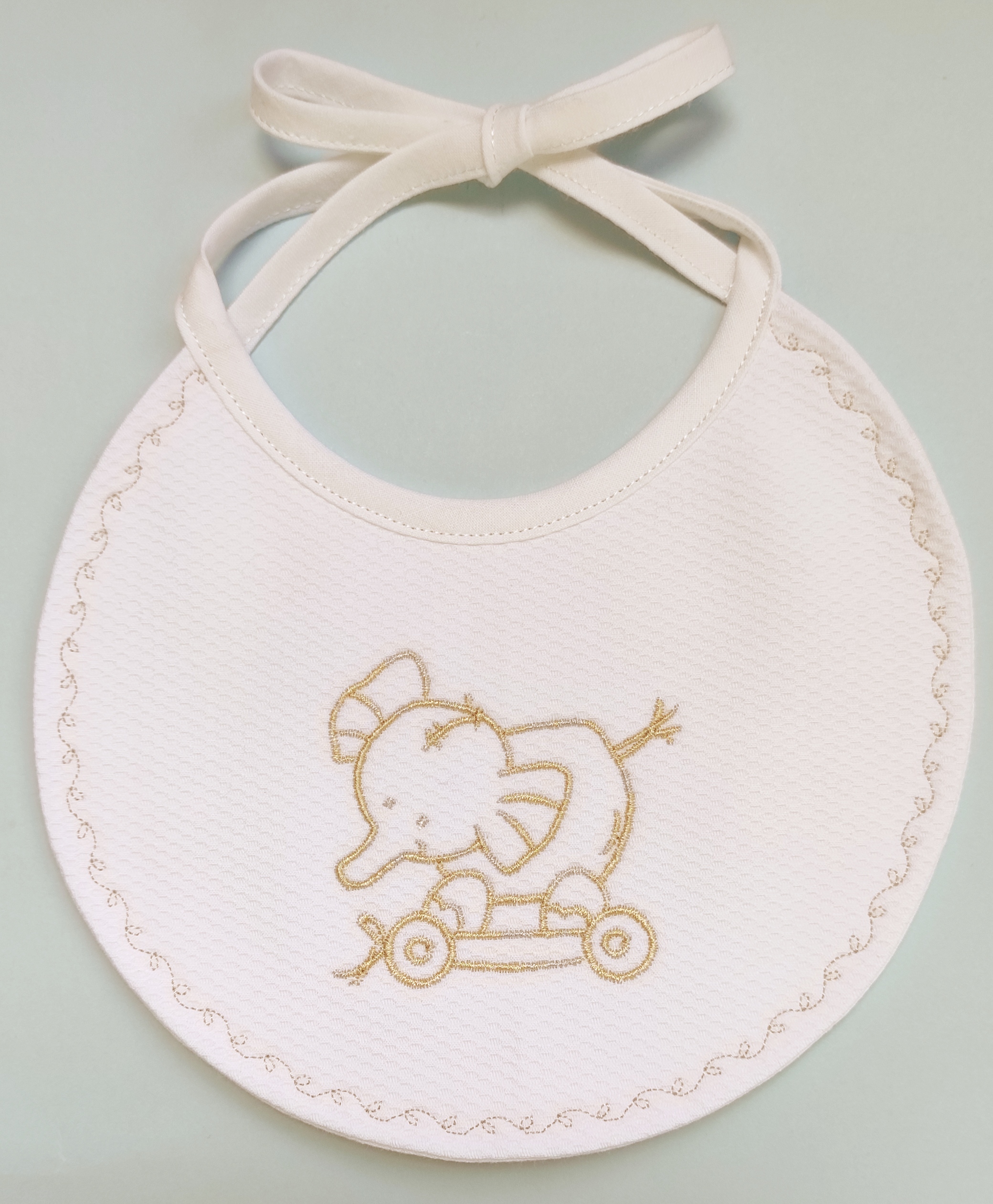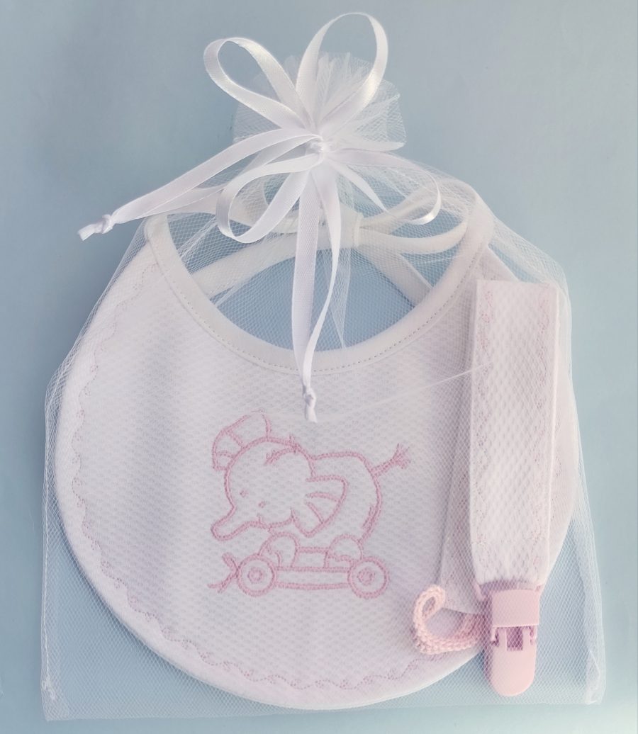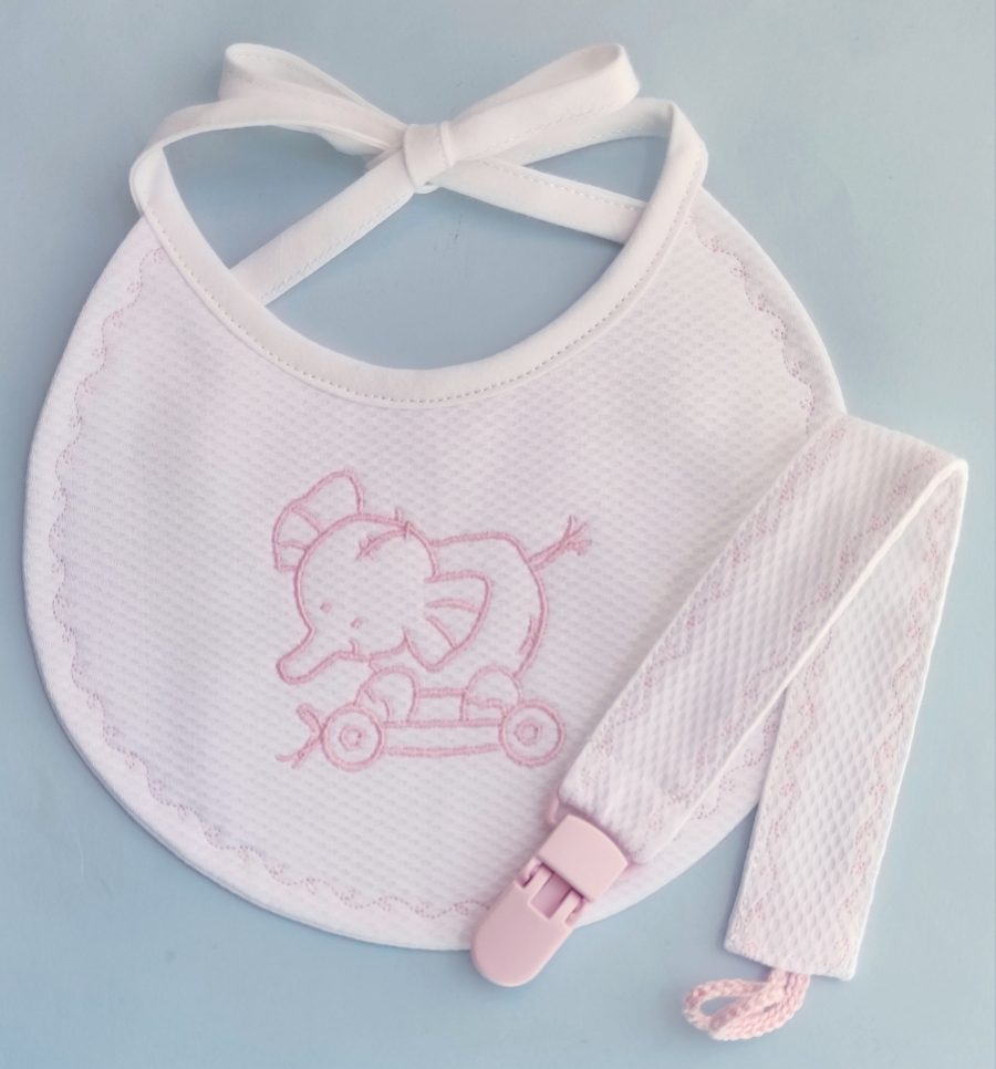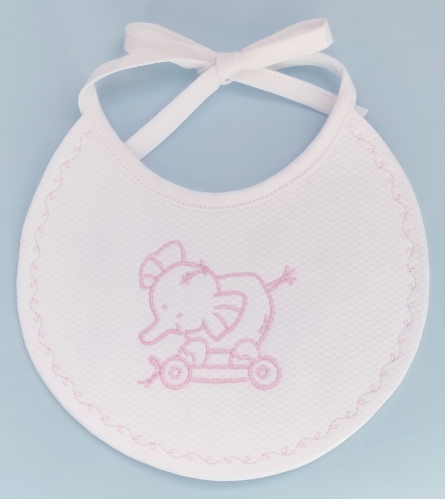 – babete em tecido piqué branco com bordado “elefante”, forrado, com interior impermeável;