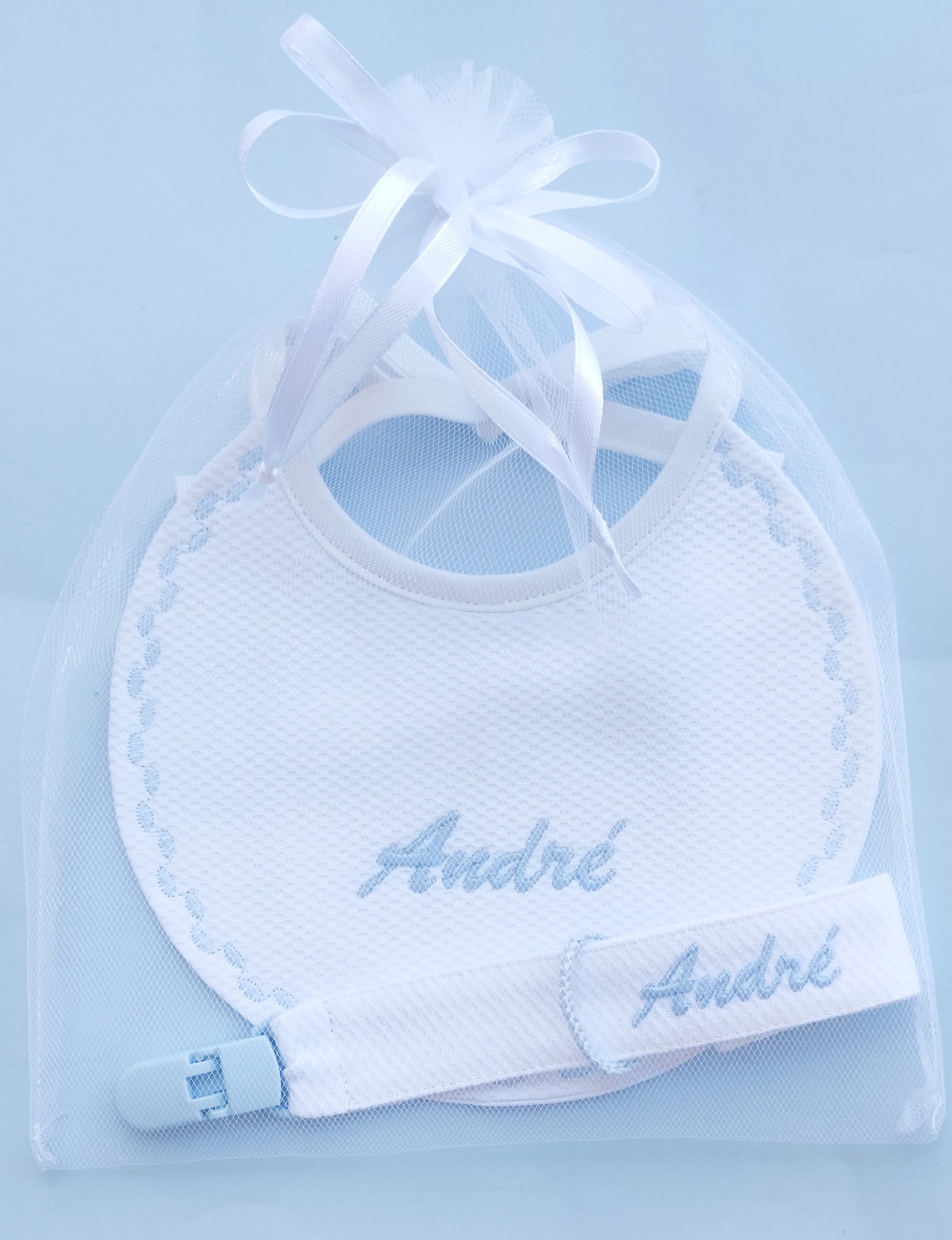 Conjunto de Babete & Fita Chupeta, fornecido em bolsinha de organza, ideal para uma prendinha!