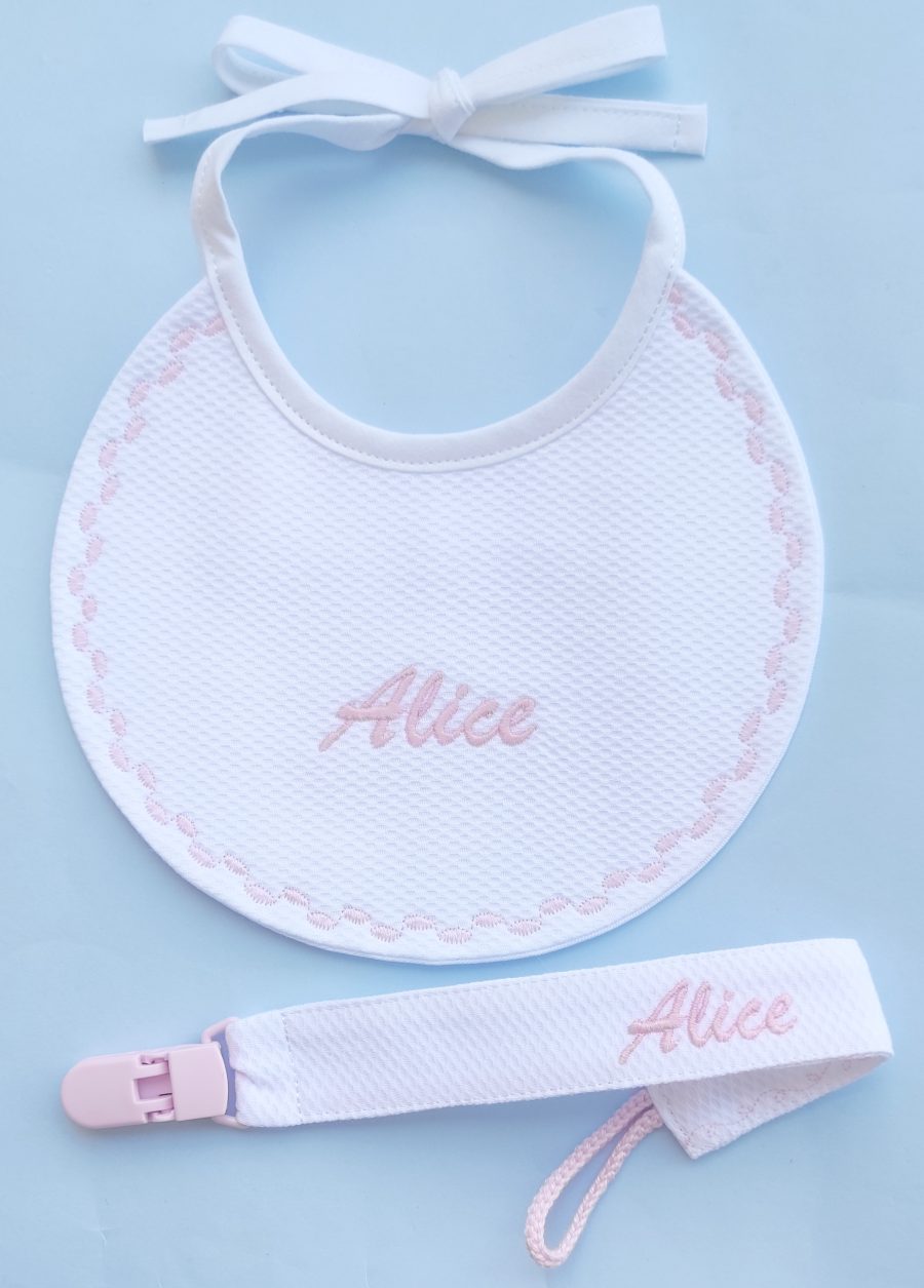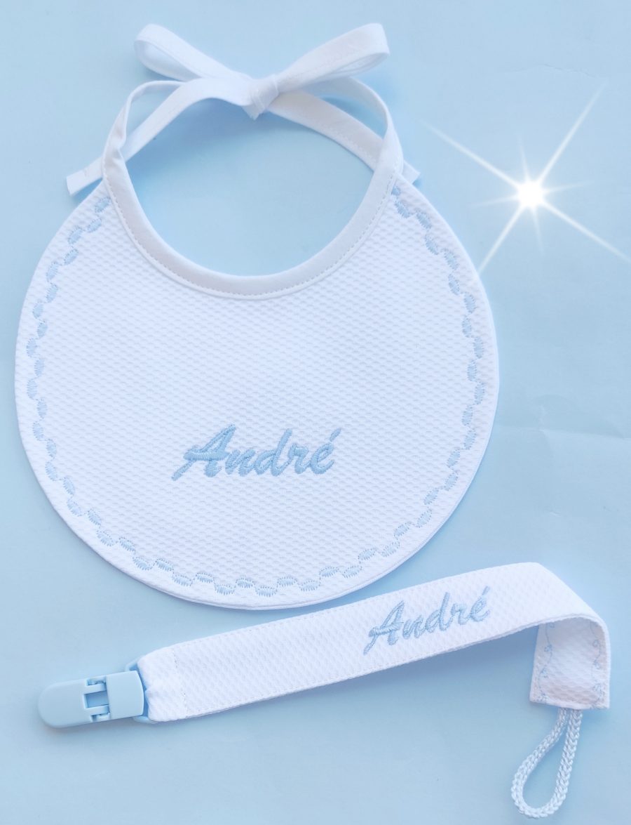 - Fita chupeta em piqué branco personalizada, a combinar.