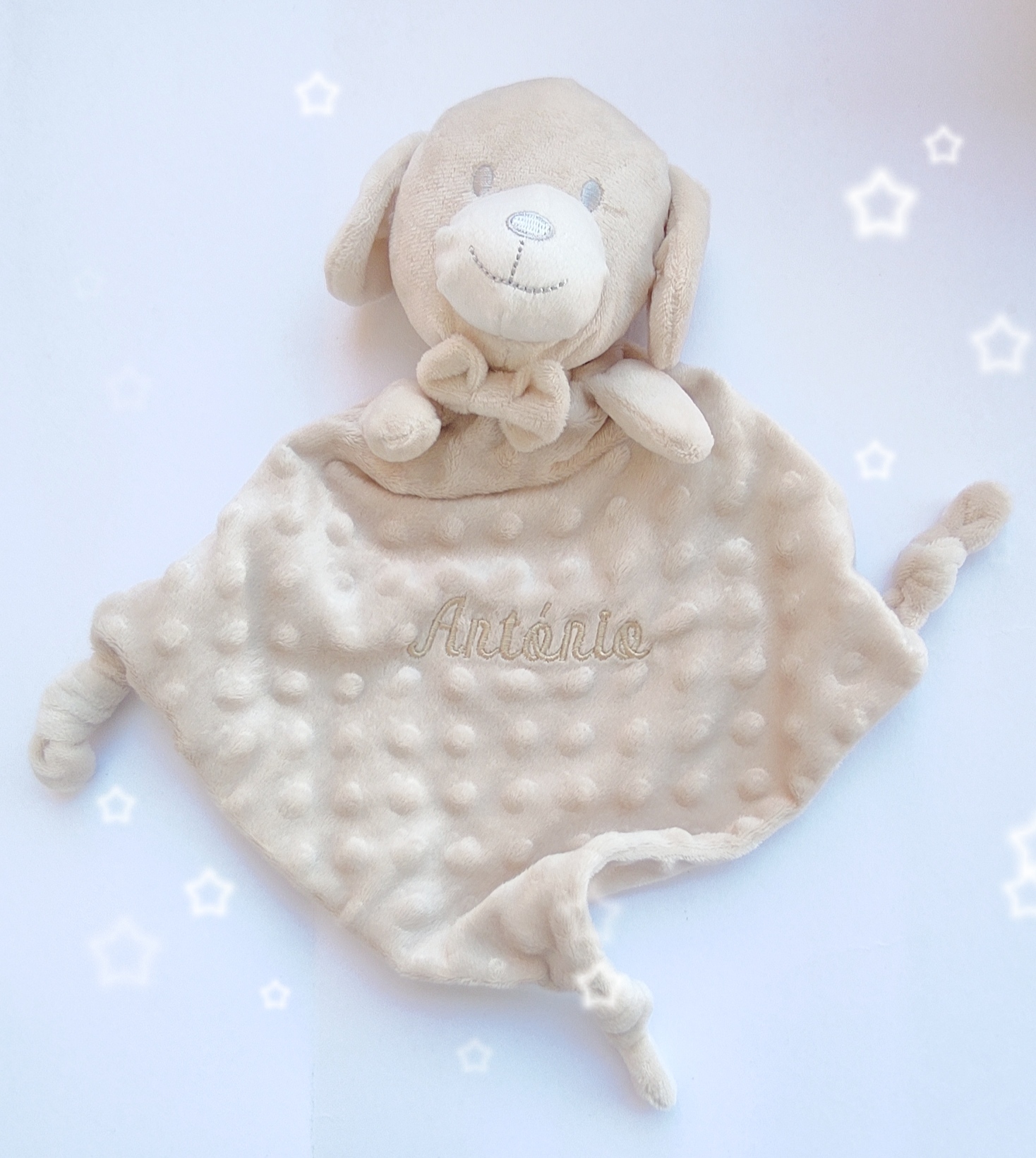 Cãozinho Doudou para bebé, com pontas em nó, em tecido muito macio, para acompanhar e tranquilizar o bebé.