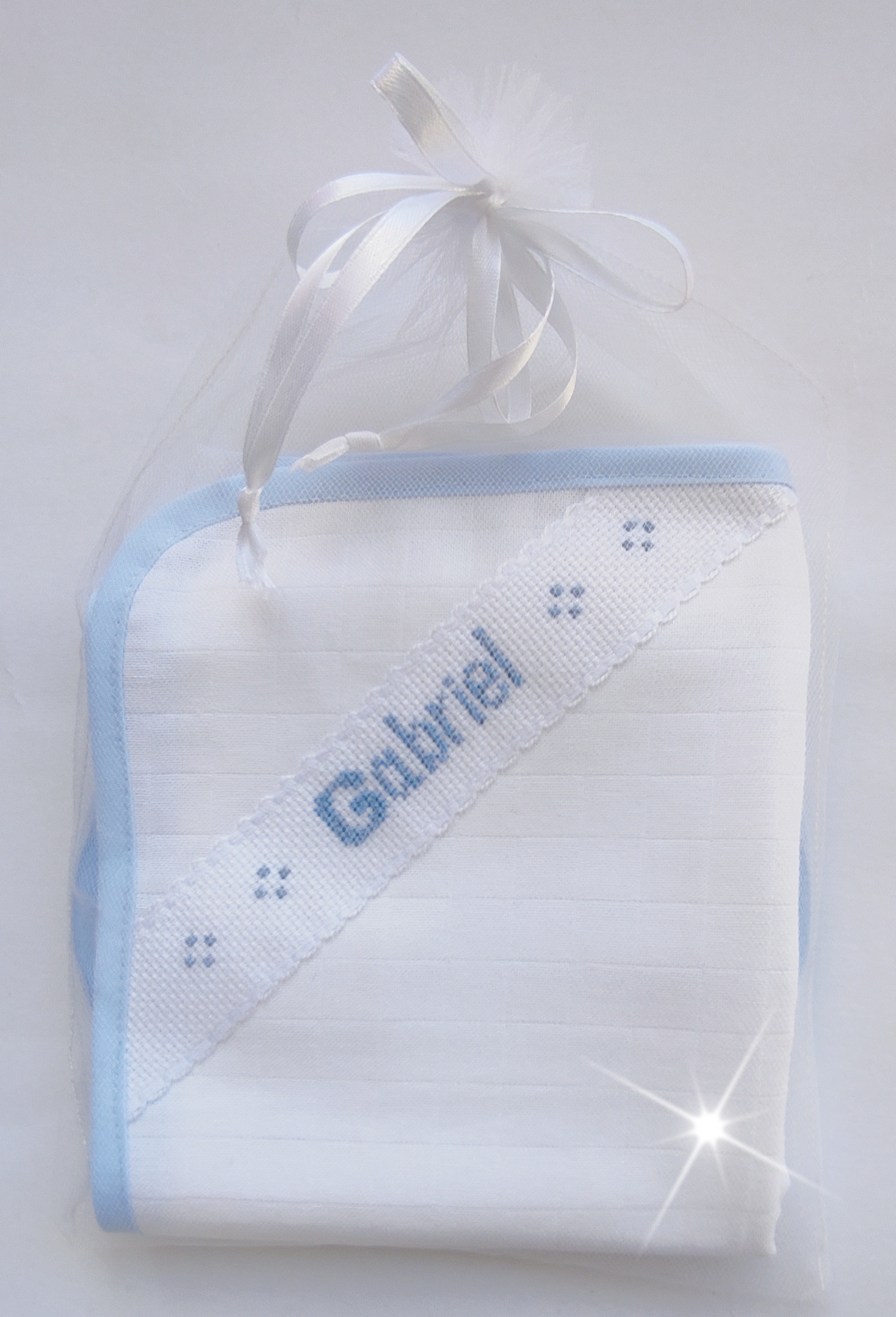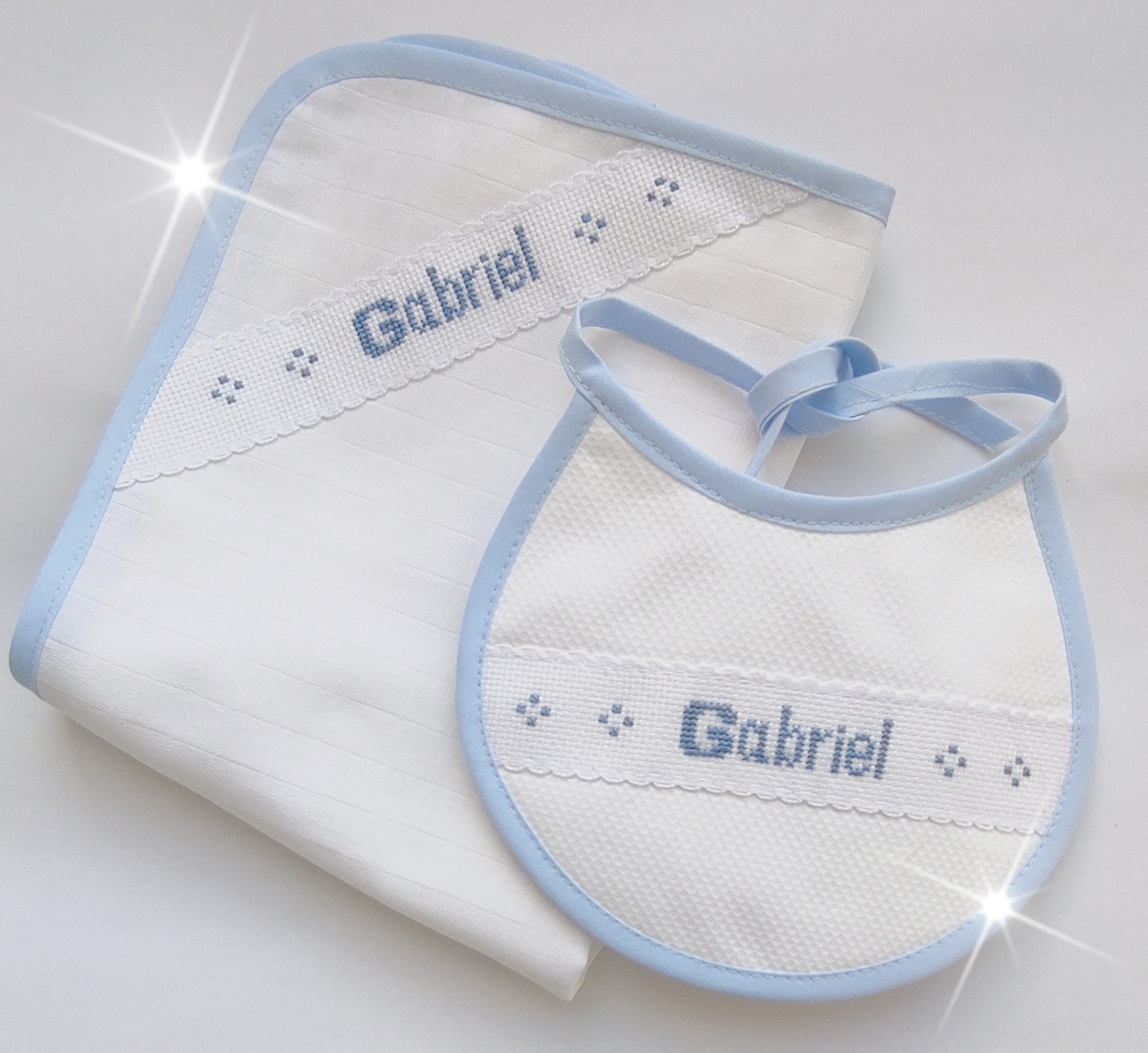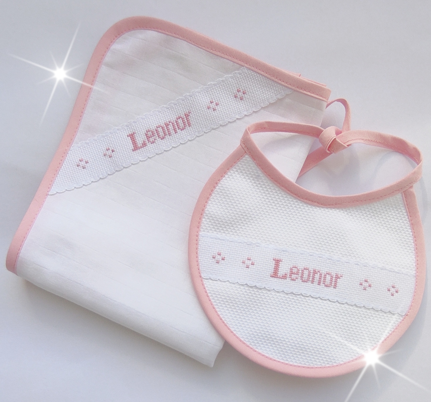 Conjunto de Fralda de Pano & Babete personalizado, bordado à mão no tradicional ponto cruz.