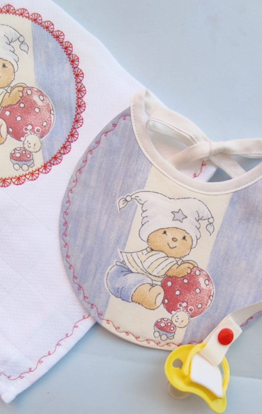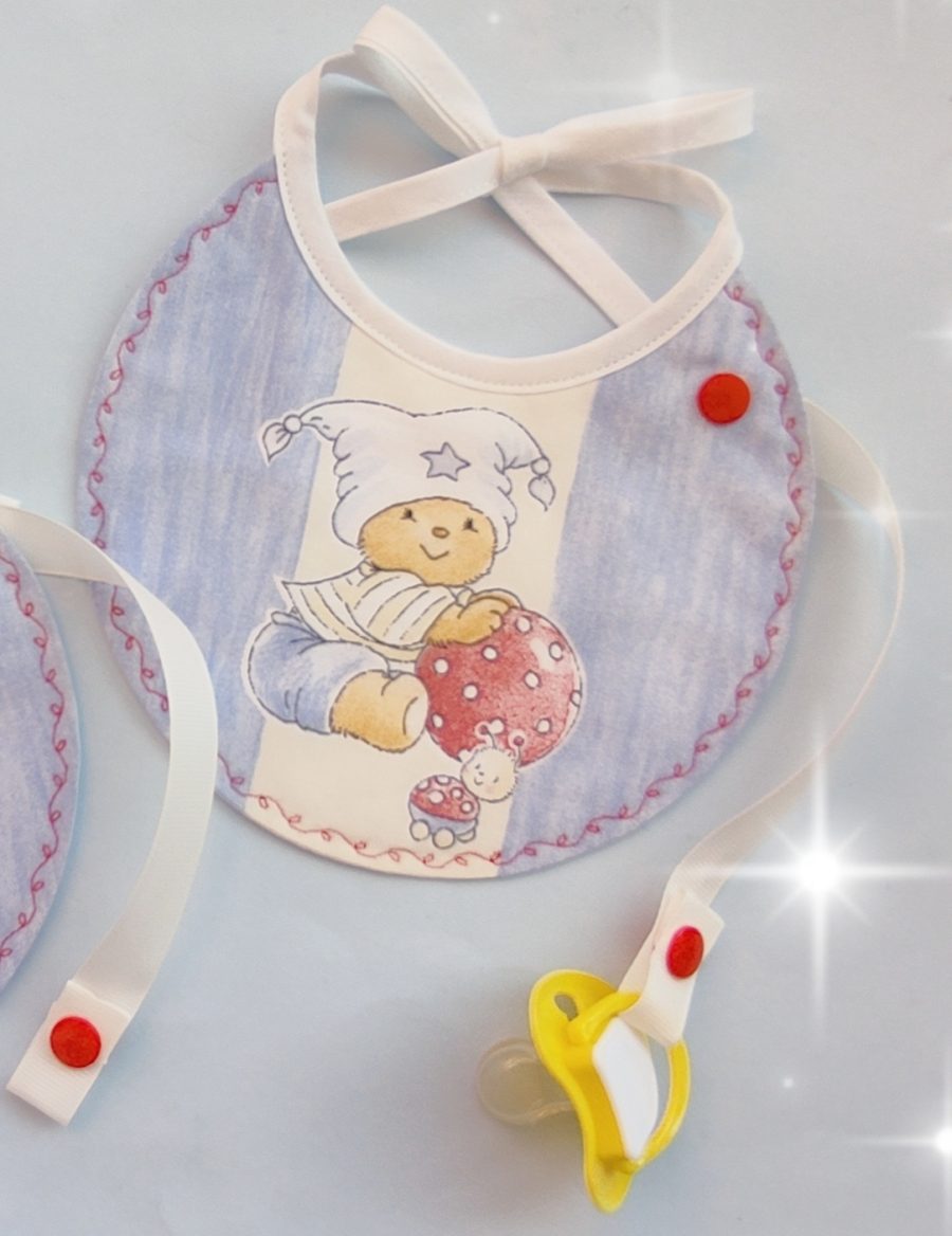 - babete impermeável, em tecido a combinar, com aplicação de fitinha removível para prender a chupeta (chupeta não incluída),